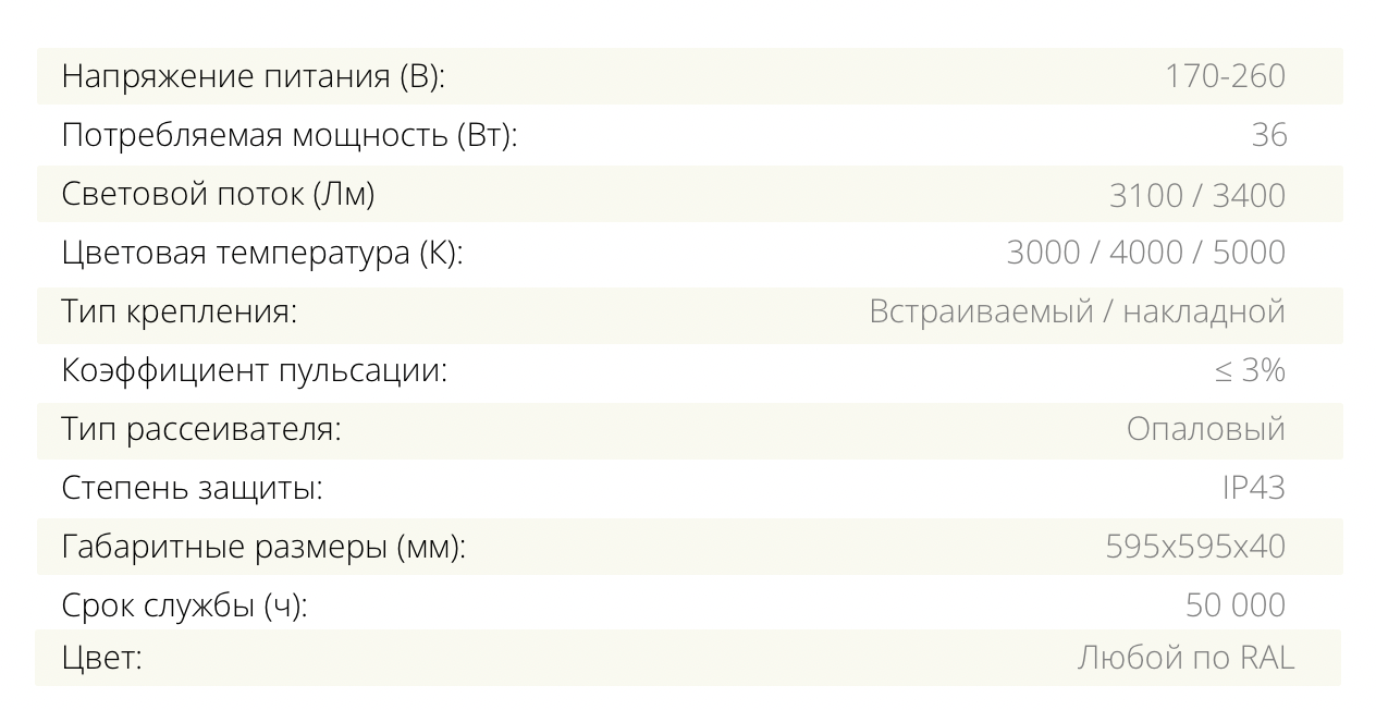 Коэффициент пульсации ≤ 3% гарантирует комфортное освещение без мерцания. Можно использовать встраиваемый или накладной тип крепления. Степень защиты IP43 делает светильник подходящим для использования в различных интерьерах. Диаметр светильника составляет 595 мм. Срок службы до 50 000 часов и возможность выбора любого цвета по шкале RAL позволяют интегрировать светильник Quadro Office в любой дизайн интерьера.