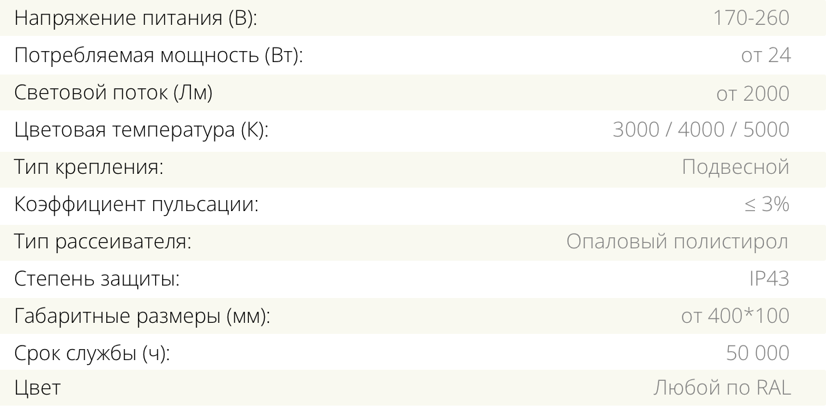 Подвесное крепление и опаловый полистироловый рассеиватель обеспечивают равномерное и мягкое освещение. Степень защиты IP43 делает его подходящим для различных условий. Габариты светильника начинаются от 400х100 мм, что позволяет легко интегрировать его в любой интерьер. Срок службы составляет 50 000 часов, а цвет может быть любым по шкале RAL, что обеспечивает долгую и надежную эксплуатацию и позволяет выбрать цвет под любой дизайн.